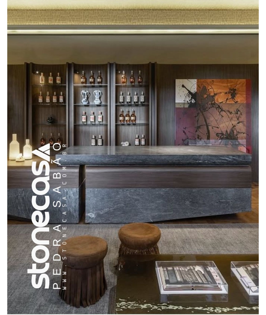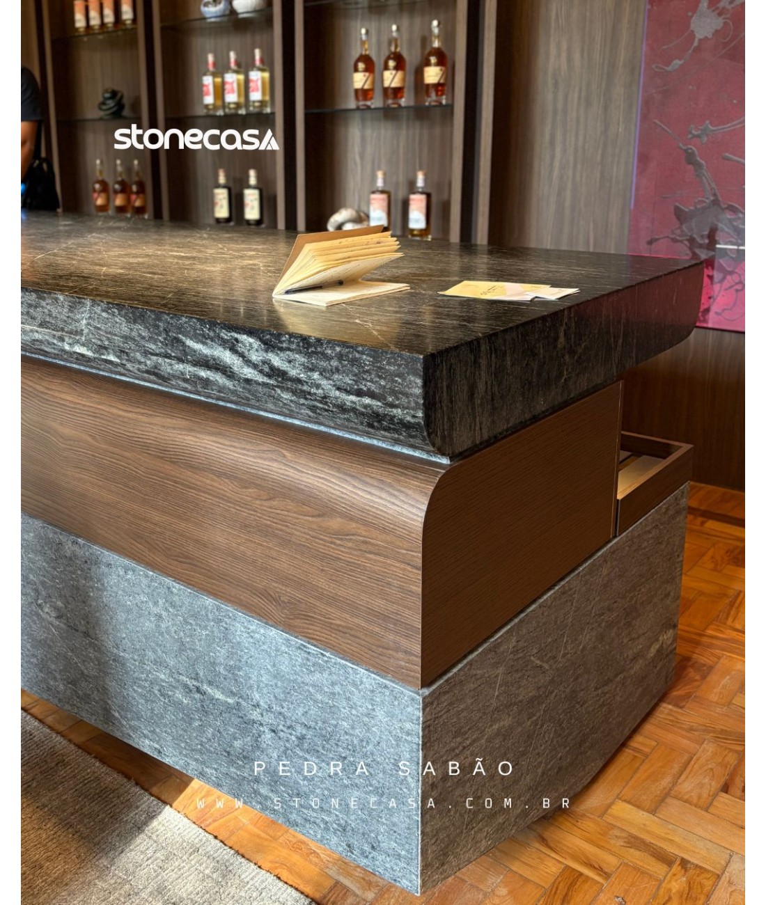 O projeto apresentado pela Stone Casa® combina pedra-sabão cinza-escura com madeira nobre, resultando em um contraste sofisticado que valoriza o ambiente.