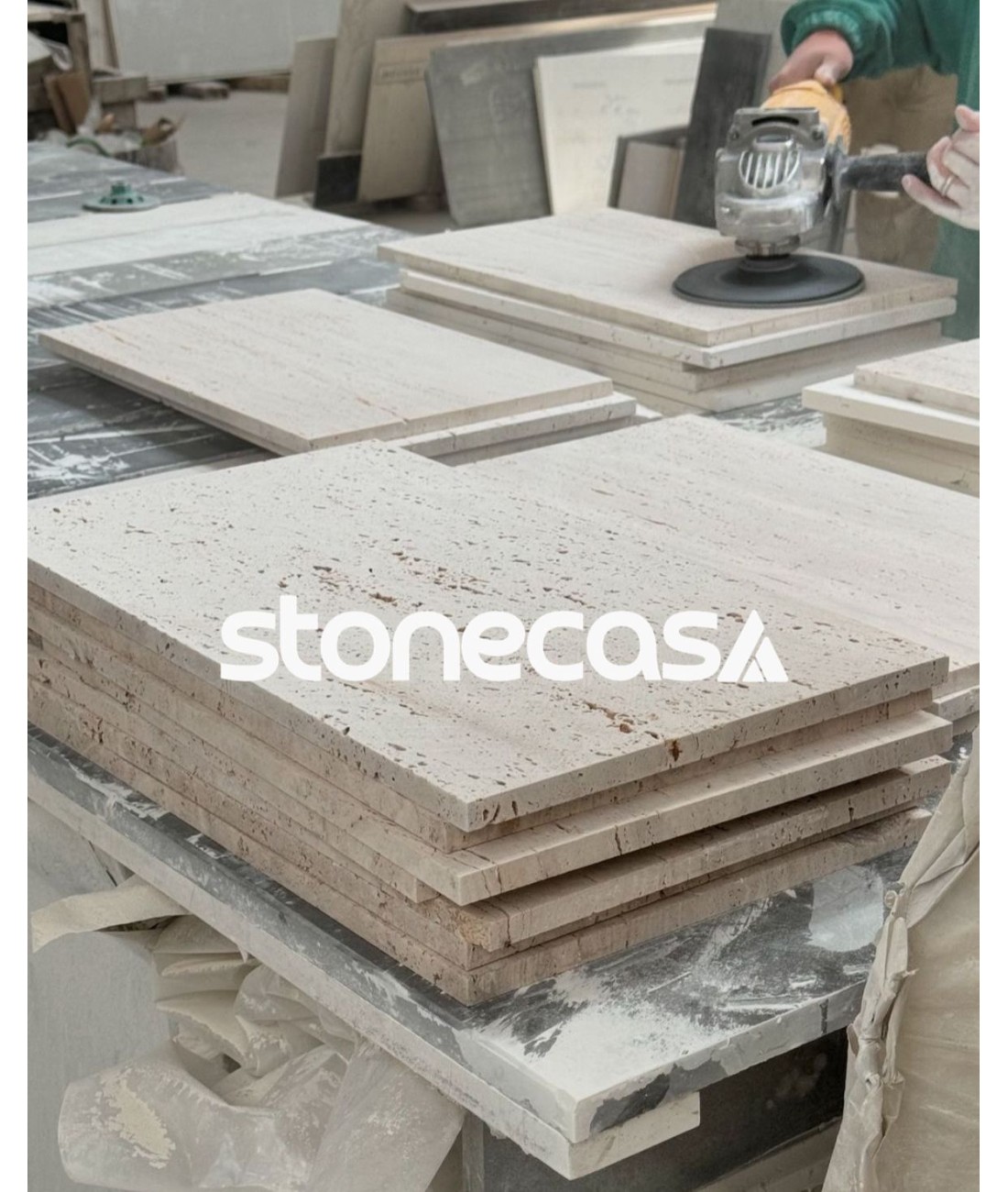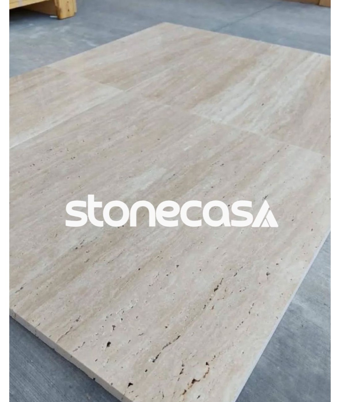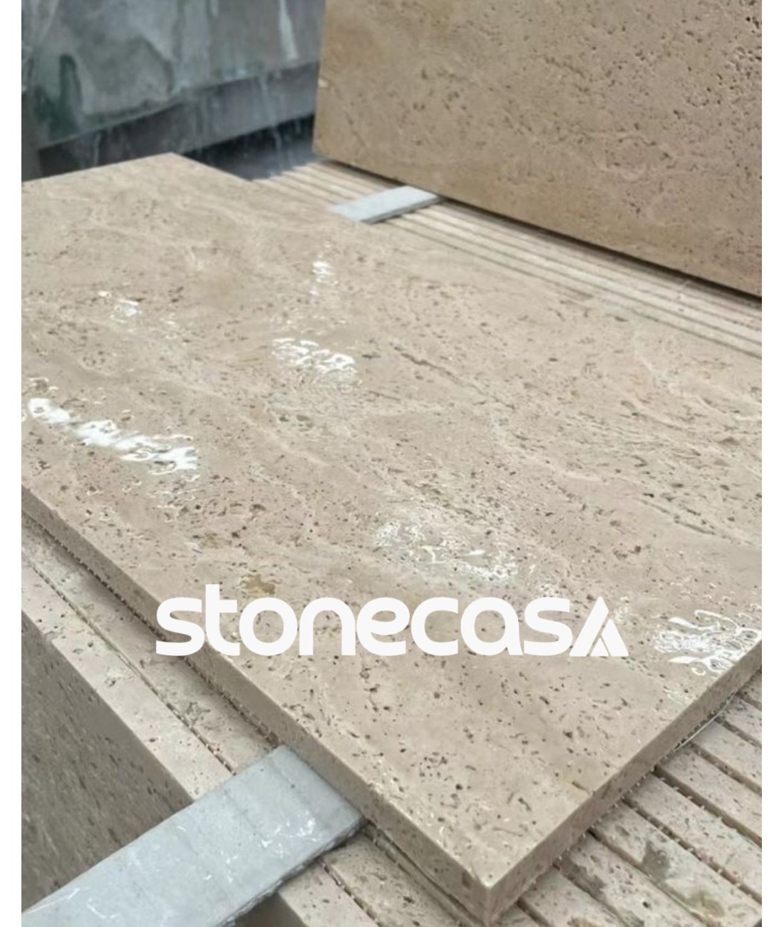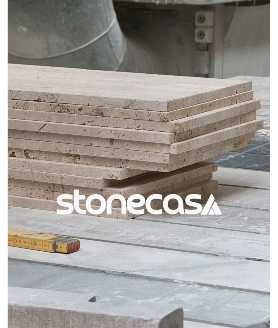 O Travertino Romano Italiano Stone Casa® é oferecido em chapas grandes e ladrilhos cortados sob medida, garantindo flexibilidade arquitetônica total.