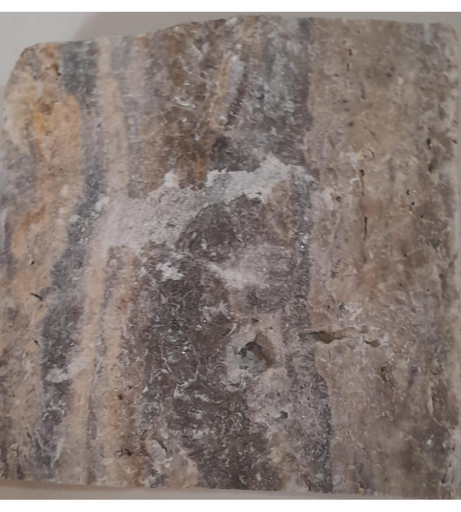 Composição: rocha calcária formada por depósitos de carbonato de cálcio com poros característicos.