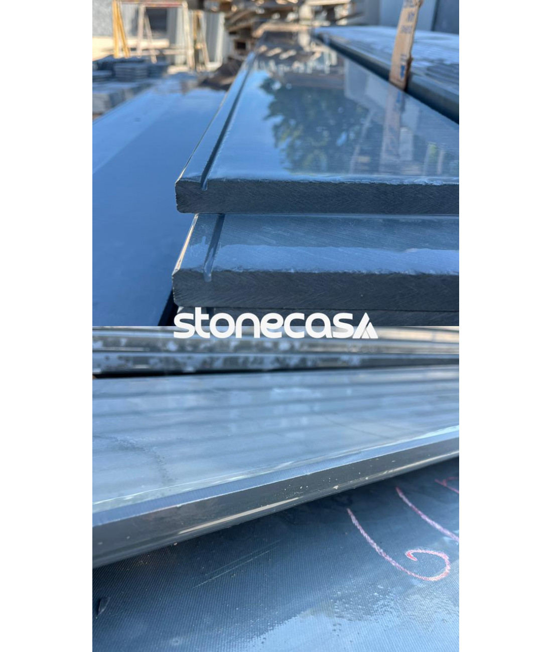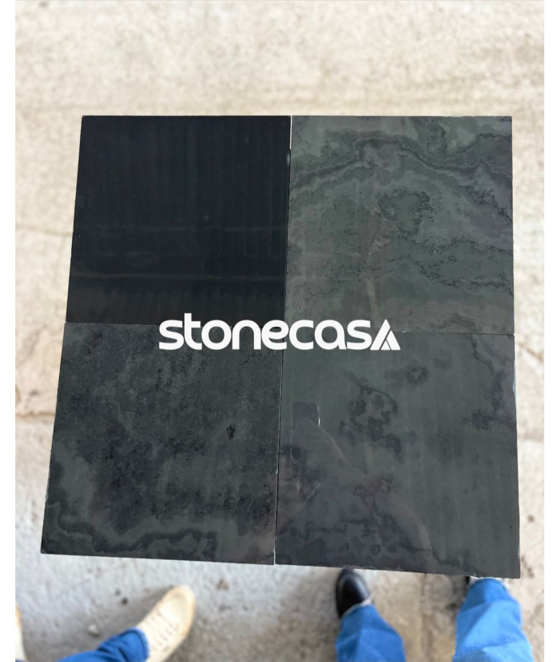 O acabamento polido proporciona uma superfície lisa e brilhante, realçando as nuances escuras e os padrões naturais da pedra. Essa opção é perfeita para quem busca um toque de luxo em bancadas, painéis, escadas e revestimentos internos.