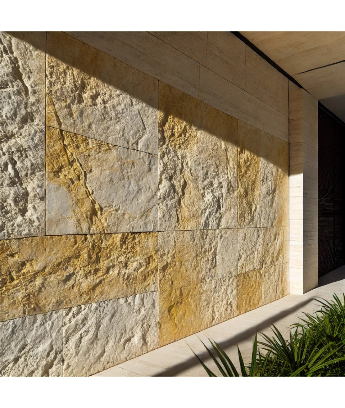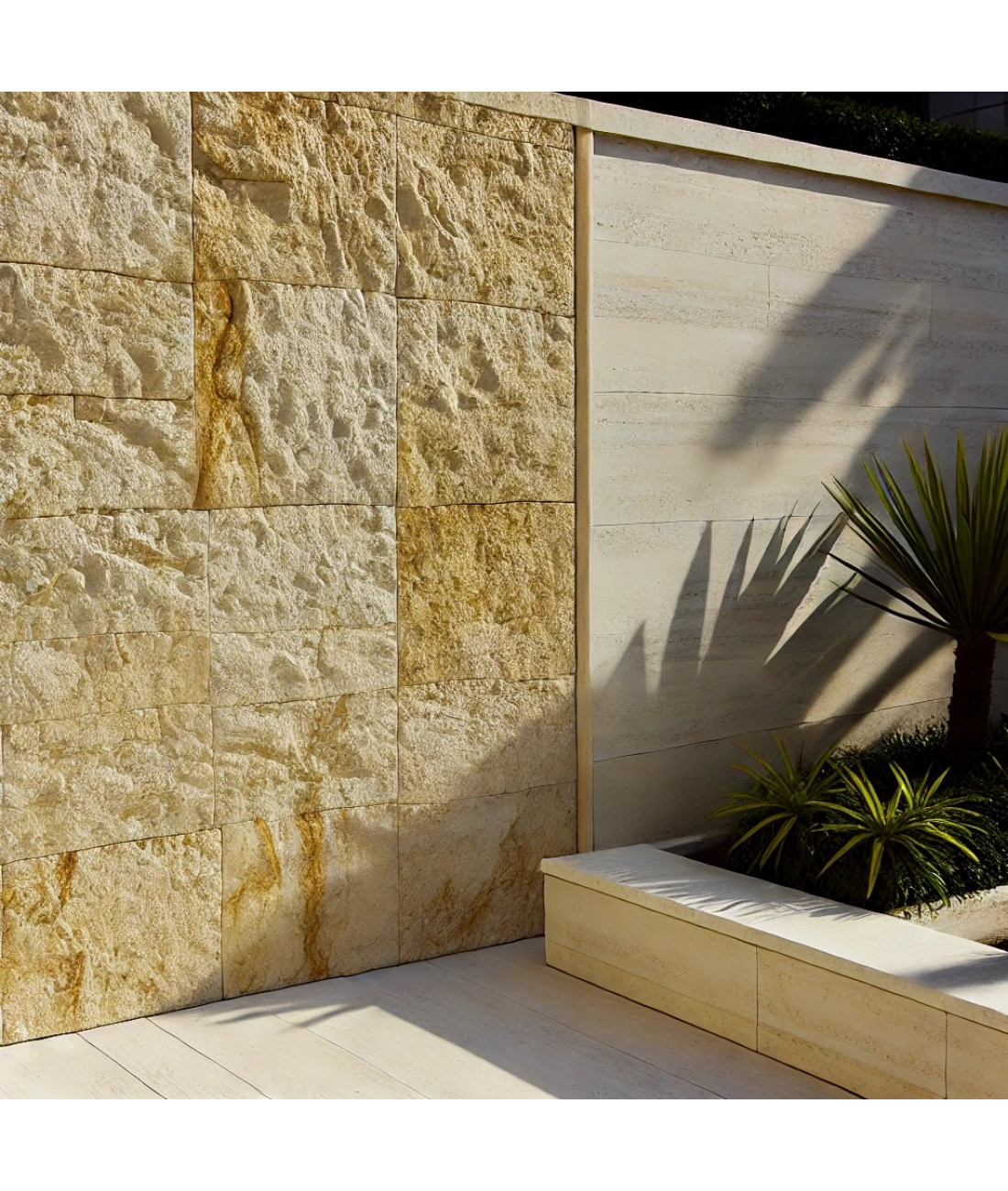 A aparência do Travertino Cairo é marcada por sua coloração distinta. Tons de branco e amarelo entrelaçados com veios dourados oferecem um visual que capta a essência das paisagens do Egito. A superfície rústica desta pedra, em acabamento Rock Face, proporciona um efeito tridimensional, dando profundidade e textura a qualquer ambiente. Esse contraste entre rusticidade e suavidade torna o Travertino Cairo uma pedra surpreendente, capaz de transformar paredes e fachadas em verdadeiras obras de arte